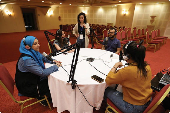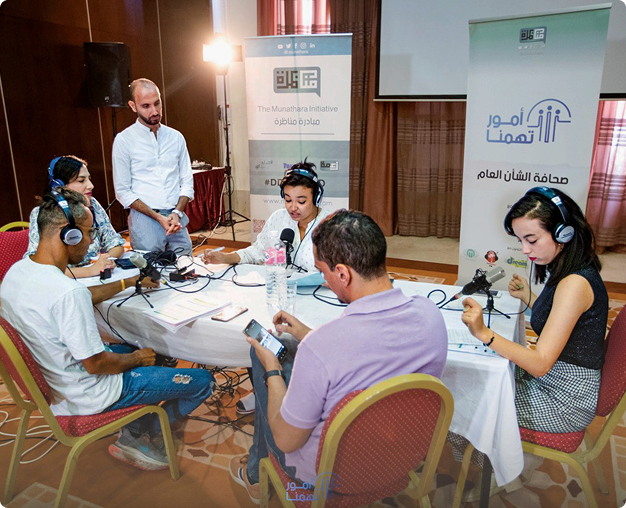 Each program is paired with a tailored curriculum designed to equip participants with the skills, knowledge, and ethical grounding needed to become effective contributors to public discourse.Munathara’s workshops blend theory and practice across diverse disciplines, including debate and public speaking, journalism, media literacy, fact-checking, civic engagement, and content creation. Whether through intensive local bootcamps or online sessions, certified trainers and subject-matter experts guide participants through modules on argumentation, storytelling, critical thinking, and digital media production.Participants also gain hands-on experience in podcasting, community radio, tv presenting, and broadcast journalism, with a strong focus on journalistic ethics, audience engagement, legal literacy, and digital safety. They learn how to conduct rigorous research, counter misinformation, and craft inclusive, community-rooted narratives.These workshops not only prepare participants to fulfill the demands of their specific projects but also help build a new generation of ethical, articulate voices championing human rights, accountability, and constructive dialogue across the MENA region.